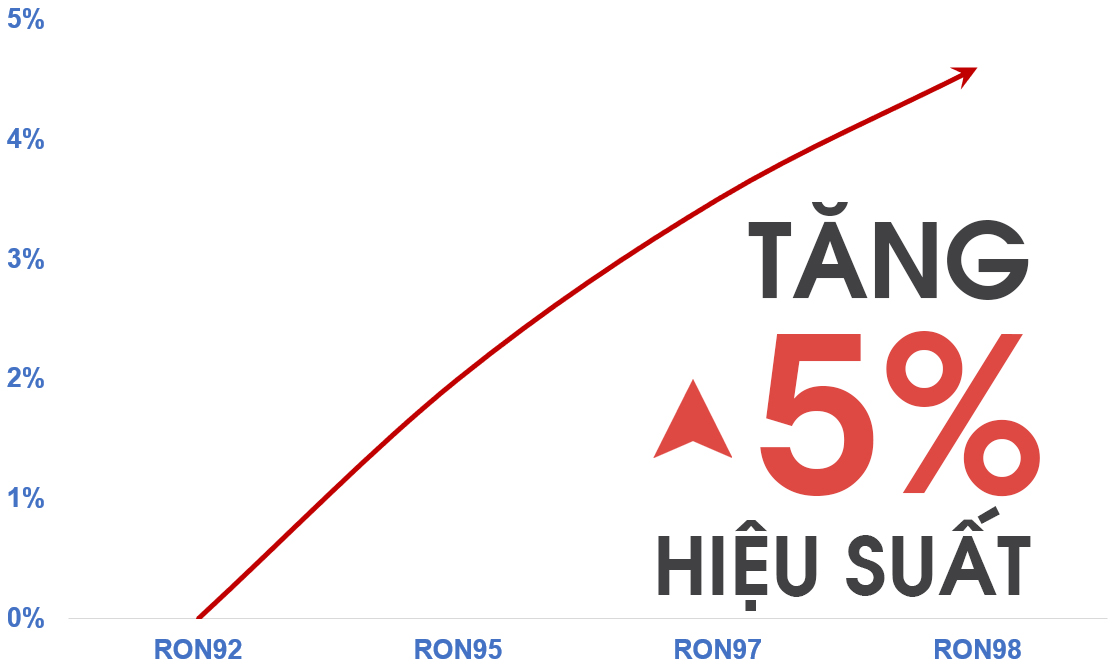 Với động cơ xăng, khi được sử dụng loại xăng có trị số Octan cao hơn thì lực nén piston sẽ mạnh hơn. Đối với động cơ dầu thì giá trị này là trị số Xetan. Dễ dàng thấy, xăng Euro 5 RON 97 và RON 98 có trị số octan (97 – 98) cao hơn hẳn xăng RON 95 (95). Tương tự, dầu Euro 5 DO-0,001S có trị số xetan 51 sẽ cao hơn dầu Euro 2 DO 0,05S với trị số xetan chỉ đạt mức 46 (số liệu dựa theo bảng chỉ tiêu chất lượng dầu Diesel). Theo một nghiên cứu của hãng xe Ford được đăng trên tạp chí Khoa học Công nghệ và Môi trường năm 2018, xăng đạt tiêu chuẩn Euro 5 sẽ làm tăng hiệu suất của động cơ lên tới hơn 5% so với xăng RON 92 đang được lưu hành. Bạn sẽ cảm nhận được độ “bốc” hơn đáng kể của động cơ khi được sử dụng loại nhiên liệu Euro 5 mới này.